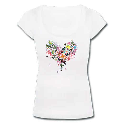 Λευκό Γυναικείο Μακό με Ανοιχτό Λαιμό και Πεταλούδες και Λουλουδάκια για μοντέρνες γυναίκες από 18 έως 30 χρονών ΓΥΝΑΙΚΕΙΟ T-SHIRT ΠΟΙΟTHTA — JERSEY 150 100% βαμβάκι Ringspun σεμί-πενιέ ΣΤΥΛ — Θηλυκό με Βαθιά Λαιμοκοψη