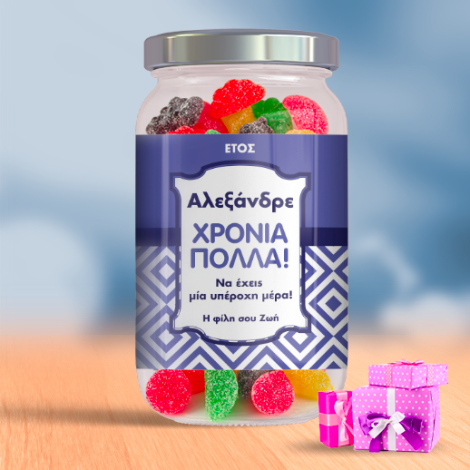 Το Προσωποποιημένο Δώρο για Ονομαστική Εορτή, Βαζάκι με καραμέλες με Όνομα, μπορεί να δοθεί σαν δώρο ονομαστικής γιορτής στην Γιαγιά, τον παπππού ή ακόμα και στον μπαμπά ή την Μαμά και θα είναι το δώρο εκπληξη που θα μείνει για πάντα αναμνηστικό στο σπίτι.