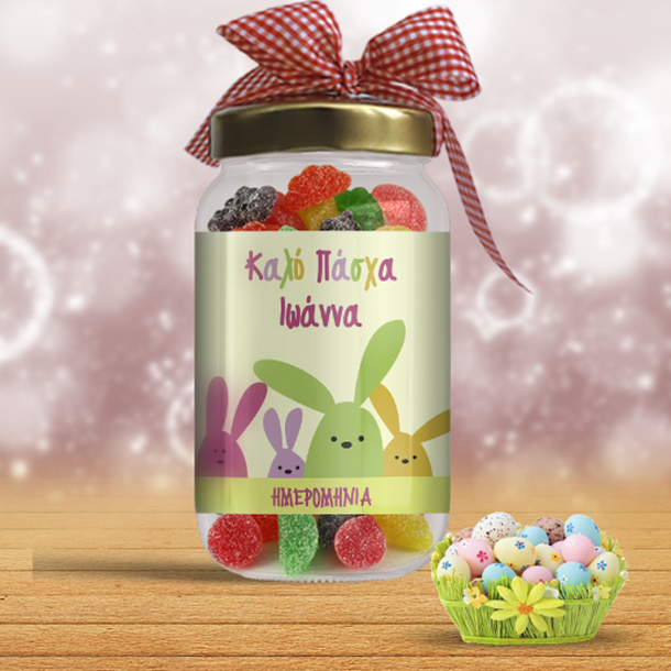 Πρωτότυπο αναμνηστικό Πασχαλινό Δώρο για όλους, Προσωποποιημένο Βαζάκι με Λαγουδάκια για το Πάσχα με Καραμέλες, με όνομα και ημερομηνία για τις ημέρες του Πάσχα, για να πείτε τα Χρόνια Πολλλά και να εκφράσετε την αγάπη σας με ένα ξεχωριστό τρόπο και με ένα μοναδικό και προσωπικό δώρο.