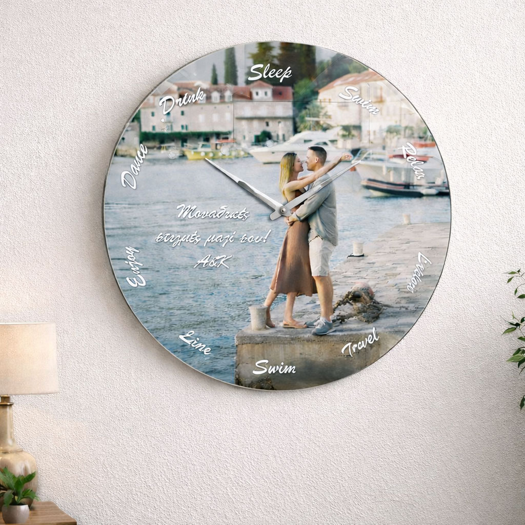 Το μοναδικό Δώρο για την επέτειο κάθε ζευγαριού Ρολόι Τοίχου με Φωτογραφία, μήνυμα σε κάθε ώρα, είναι το προσωποποιημένο δώρο που φτιάχνεται χειροποίητα αποκλειστικά για την δική σας επέτειο, είναι το δώρο έξω από τα συνηθισμένα που θα ξεχωρίσει. Με Φωτογραφία, Ρολόι Τοίχου, Προσωποποιημένο με Ευχές, Όνομα για την γιορτή των ερωτευμένων, valentine's day.