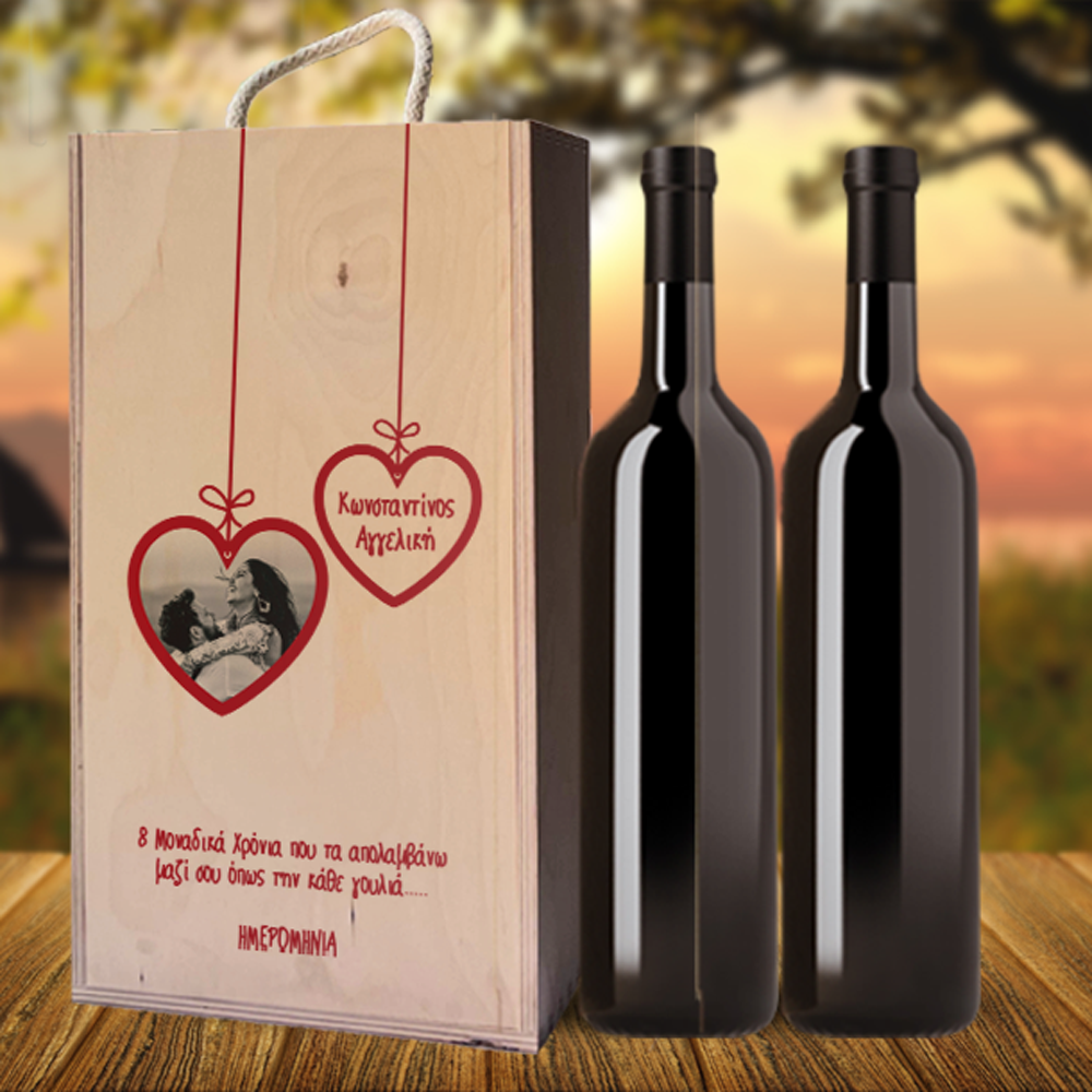 Β. Με Κόκκινο Κρασί Ξύλινο Κουτί με ειδική Προσωποποιημένη εκτύπωση και ένα Κόκκινο Μπουκάλι Κρασί & 2 Ετικέτες