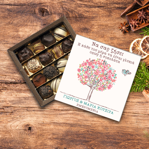Κουτί διαστάσεων 20cm X 20cm, με 400 γραμμάρια περίπου, Σοκολατάκια πραλίνες με διάφορες γεύσεις
