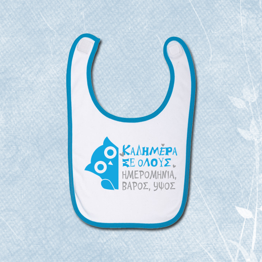 Σαλιάρα Καλημέρα σε όλους με στοιχεία μωρού, για αγοράκι, Προσωποποιημένη με ημερομηνία γέννησης για αγοράκι, με την Ηεμερομηνία γέννησης τα κιλά και το υψος, και θα είναι το διαφορετικό δώρο του Νονός, νονου ή της Νονάς στο νεογέννητο βαπτιστηρι τους.