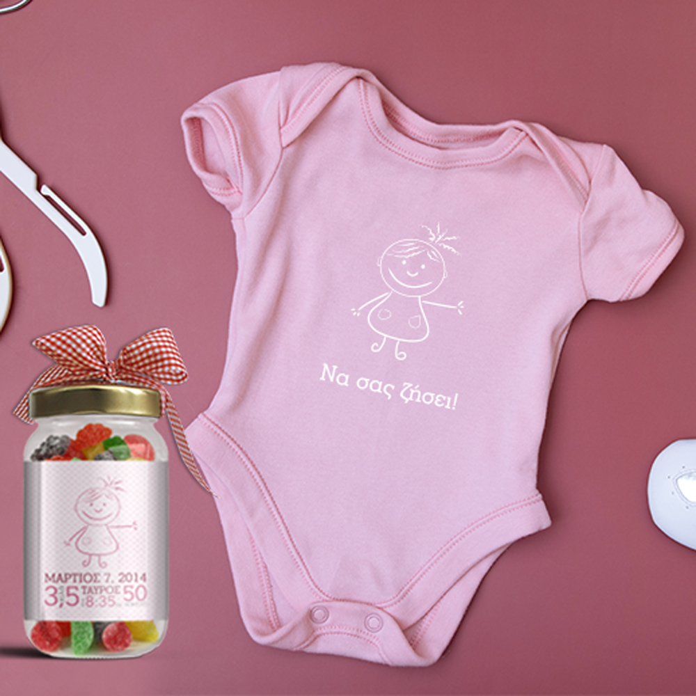 Ένα μοναδικό δώρο για κάθε νεογέννητο κοριτσάκι στο οικογενειακό σας περιβάλλον, Να σας Ζήσει, Φορμάκι, Βαζάκι με Καραμέλες, για Νεογέννητα Κοριτσάκια, Ημερομηνία, με προσωποποιημένο tshirt για να ευχηθείτε και να Καλωσορίσετε την Μπέμπα, που μόλις γεννήθηκε και να στους γονείς του.