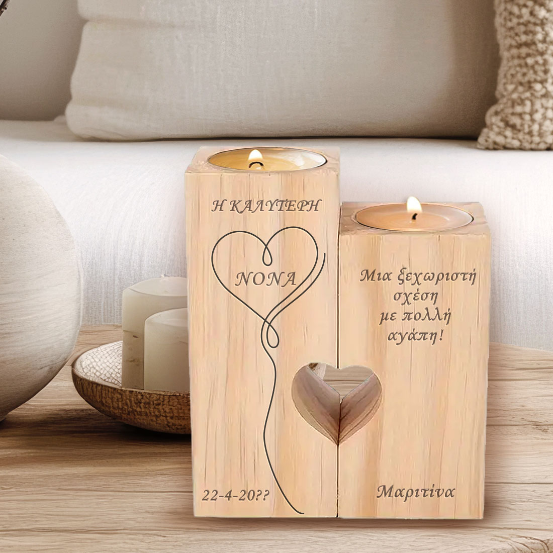 Ξύλινο Κηροπήγιο δύο θέσεων που όταν ενωθούν σχηματίζουν καρδιά