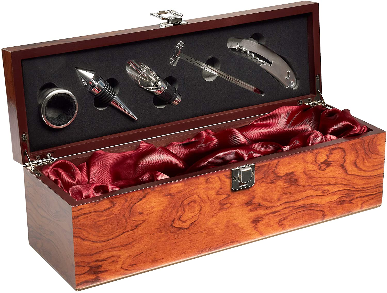 Ξύλινη Θήκη με 5 αξεσουάρ & Κρασί με Ονόματα, Θερμόμετρο, Τιρμπουσόν, Τάπα, Δακτυλίδι για σταγόνες, έξοδος σερβιρίσματος.