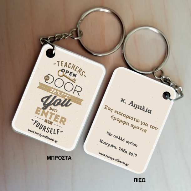 Στο familyandfriends.gr θα βρείτε μοναδικά προσωποποιημένα δώρα γενεθλίων και δώρα γιορτών προσωποποιημένα για αγόρια και κορίτσια, ανδρες και γυναίκες. Ο Δασκαλος είναι ένα ξεχωριστό πρόσωπο στην καθημερινότητα και την ζωή του καθε παιδιού που πηγαίνει σε οποιαδήποτε βαθμίδα της σχολικής εκπαίδευσης. Το Προσωποποιημένο δώρο,Teacher open door, Μπρελόκ με Μήνυμα, Ονόματα για Δάσκαλο, Καθηγητή Μαθηματικών, για Δασκάλα, Δάσκαλο, για Δάσκαλες, δασκαλους, είναι το δώρο που θα την ενθουσιάσει, και θα το κρατήσει σαν αναμνηστικό της σχολικής χρονιάς για πάντα.