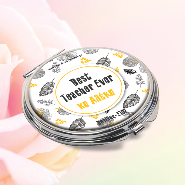 Ένα Πρωτότυπο και διαφορετικό δώρο γενεθλίων ή ονομαστικής Γιορτής για γυναίκες Προσωποποιημένο Καθρεφτάκι Τσάντας με φύλλα, δικό σας κείμενο, Όνομα, Best Teacher Ever, Δώρο για δασκαλες, είναι το δώρο που θα εντυπωσιάσει την ώρα που θα το προσφέρετε στην δασκαλα, την μαμα, την θεία ή την νονά. Best Teacher Ever, Καθρεφτάκι Τσάντας με φύλλα, δικό σας κείμενο, Όνομα Δώρο για Γυναίκες, είναι ένα διαφορετικό δώρο για την Δασκαλα του παιδιού σας, τώρα που η σχολική χρονιά τελειώνει για να βάζει τα καθημερινα καλλυντικά της και θα μείνει αναμνηστικό για πάντα. Το Καθρεπτάκι Τσάντας Δώρο για Γυναίκα Προσωποποιημένο με Ονομα μπορείτε να το προσφέρετε στην μαμα για δώρο γενεθλίων η δώρο γιορτής της μητέρας καθώς με κάθε άλλη αφορμή που θέλετε να δείξετε πόσο την αγαπάτε και ότι την θυμηθήκατε. Τα Προσωποποιημένα Καθρεπτάκια Τσάντας Δώρο για Γυναίκες είναι το δώρο που ξεχωρίζει γιατί φτιάχνεται αποκλειστικά για όποιον επιλέξετε εσείς και θα το χρησιμοποιεί κάθε μέρα για τα καλλυντικά της δημιουργώντας μοναδικές αναμνήσεις κάθε φορά. Καθρεφτάκι Τσάντας με φύλλα, δικό σας κείμενο, Όνομα Δώρο για Γυναίκες, είναι το ξεχωριστό Δώρο για την Γιορτή της μητερας και θα στολίζει για πολλά χρόνια την ντουλαπα της μαμας. Το Καθρεφτάκι Τσάντας με δικό σας κείμενο Δώρο για Γυναίκες, Δώρο Προσωποποιημένο για Γυναίκα, με Όνομα μπορεί να είναι και το δώρο ονομαστικής γιορτής για την νονα, δώρο γενεθλιων για την θεία, δώρο για την ονομαστική γιορτή της γιαγιας που γιορτάζει. Καθρεφτάκι Τσάντας με φύλλα, δικό σας κείμενο, Όνομα Προσωποποιημένο με Αρχικό Ονόματος με οποιοαδήποτε άλλη αφορμή, όπως αφιου βαλεντινου, επετειο, επετειους Συνδυάστε το με ένα Νεσεσερ για καλλυντικά με όνομα. ΠΕΡΙΓΡΑΦΗ ΠΡΟΙΌΝΤΟΣ Στρογγυλό Μεταλλικό Καθρεπτάκι Τσάντας Διαστάσεις 6 cm διάμετρος Ειδική Τετράχρωμη Εκτύπωση
