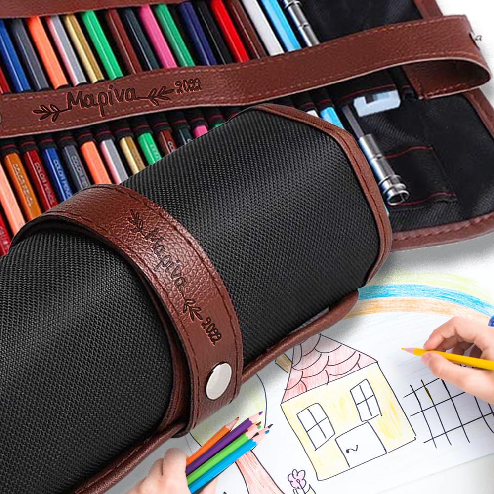 Ξυλομπογιές ζωγραφικής 48 τμχ, σε πτυσσόμενη Κασετίνα με Δερμάτινο κλείσιμο με όνομα του παιδιού, χαραγμένα με λέιζερ, laser, Ένα πρωτότυπο δώρο για την νέα σχολική χρονιά, που θα κάνει η νονά στο βαπτιστήρι της, η θεία στο ανιψάκι της, η γιαγια στο αγαπημένο της εγγονάκι, για να φτιάχνουν τις ζωγραφιές τους.