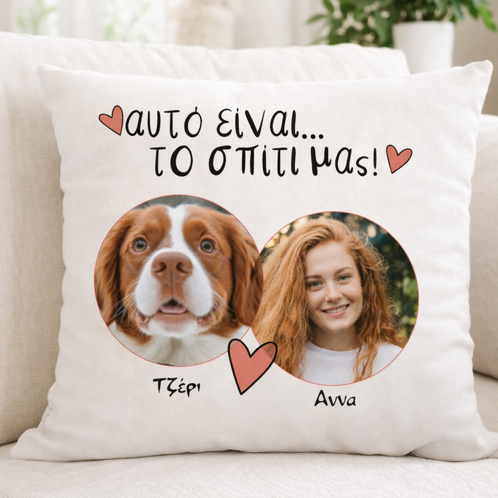 Το προσωποποιημένο μαξιλάρι με φωτογραφίες κατοικίδιου και ιδιοκτήτη, μαζί με τα ονόματα τους είναι ένα μοναδικό διακοσμητικό για τον καναπέ στο καθηστικο σας.