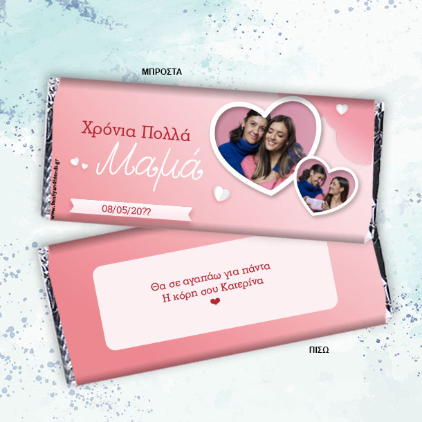 Προσωποποιημένη εκτύπωση σε περιτύλιγμα σοκολάτας 2 Φωτογραφίες, Ονόματα, Μήνυμα, δώρο στην Μαμα για την 1η Γιορτή Μητέρας, Ευχές, μπορείτε να γράψετε το όνομα σας και την ημερομηνία που θα δώσετε το δώρο. Δώρο με αφορμή τα Γενέθλια ή την Ονομαστική γιορτή της πολυαγαπημένης σας μαμάς που θα μείνει για πάντα στο γραφείο της και θα δημιουργεί κάθε φορά μοναδικές αναμνήσεις!