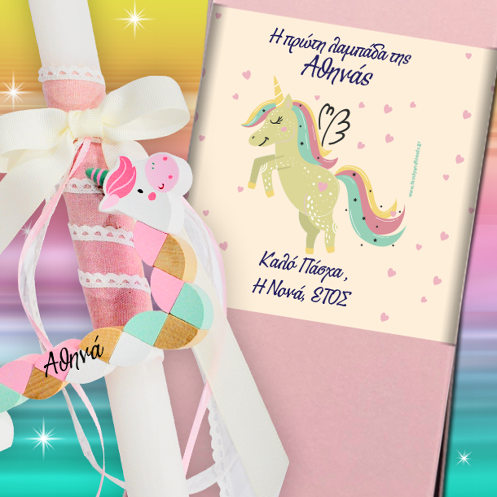 Λαμπάδα με Παιχνίδι Μονόκερο σε Κουτί με Όνομα, Ευχές