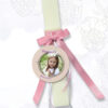 Πασχαλινή Χειροποίητη Λαμπάδα με Φωτογραφία, Όνομα, για αγόρια με διακόσμηση από ύφασμα και δαντέλα με σατέν κορδέλες και Προσωποποιημένο με Όνομα Ξύλινο διακοσμητικό με ειδική εκτύπωση.