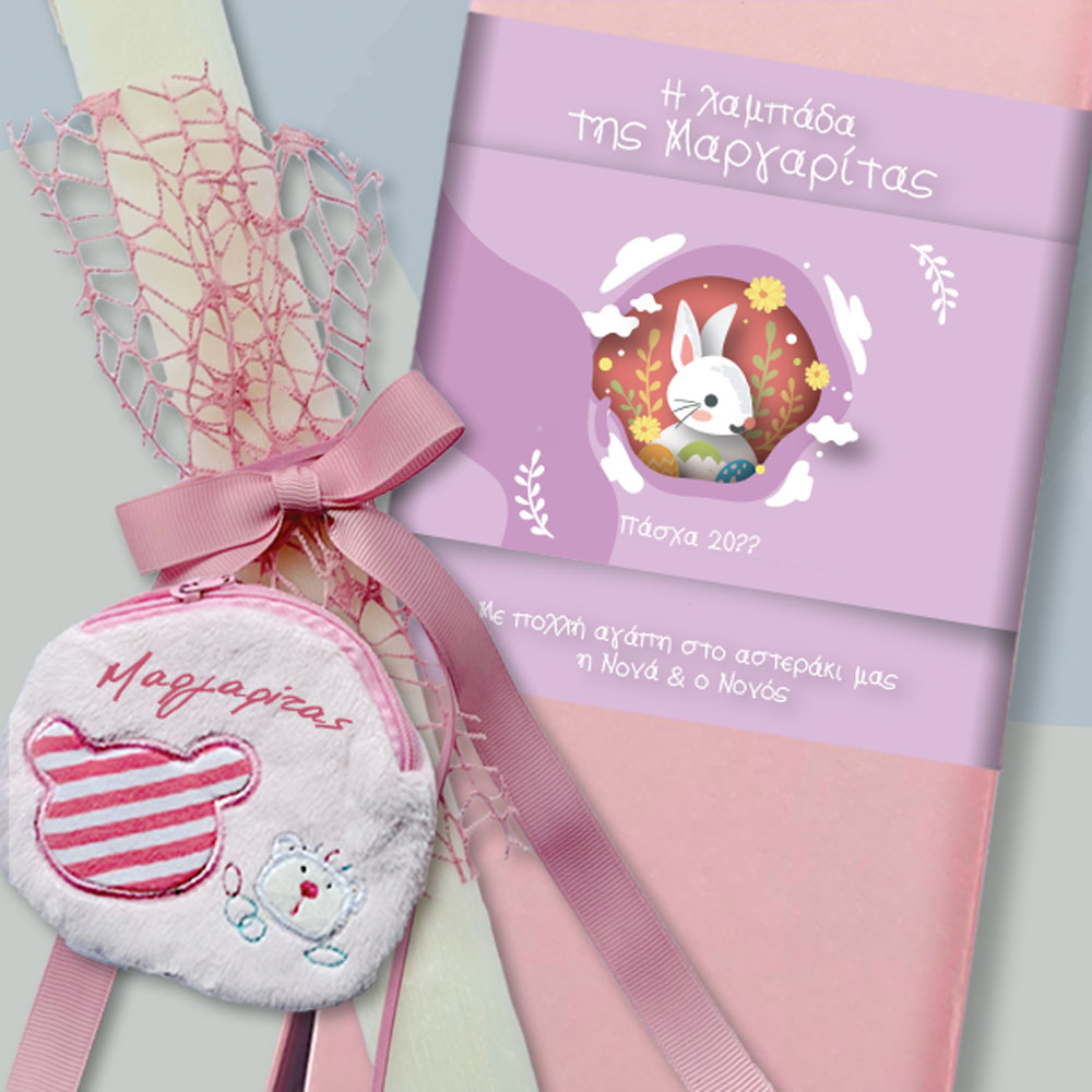 Χειροποίητη Πασχαλινή Λαμπάδα με διακόσμηση από ύφασμα και δαντέλα με σατέν κορδέλες και Προσωποποιημένο με Όνομα Πορτοφολάκι διακοσμητικό με ειδική εκτύπωση.