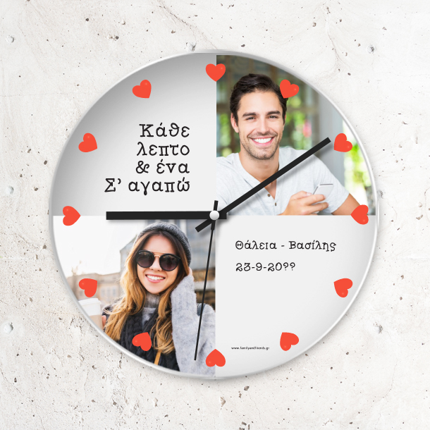 Ρολόι Τοίχου με δύο Φωτογραφίες, Καρδιές, Ονόματα, Μήνυμα