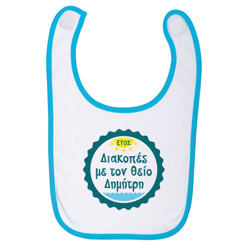 Η Προσωποποιημένη Σαλιάρα με στάμπα, Διακοπές με τον θείο, είναι το Προσωποποιημένο καλοκαιρινό Δώρο που μπορεί να κάνει και η νονά στο βαφτιστήρι της αλλάζοντας εύκολα και γρήγορα το μήνυμα! Ενα ξεχωριστό δώρο με αφορμή τις διακοπές που θα ξεχωρίσει από όλα τα άλλα δώρα γιατί θα δημιουργεί ξεχωριστές αναμνήσεις κάθε στιγμή που θα το φοράει το μωράκι!