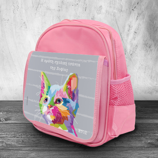 Τσάντα Νηπιαγωγείου για κορίτσια με Πολύχρωμη Γάτα, Όνομα, Έτος για Κορίτσια