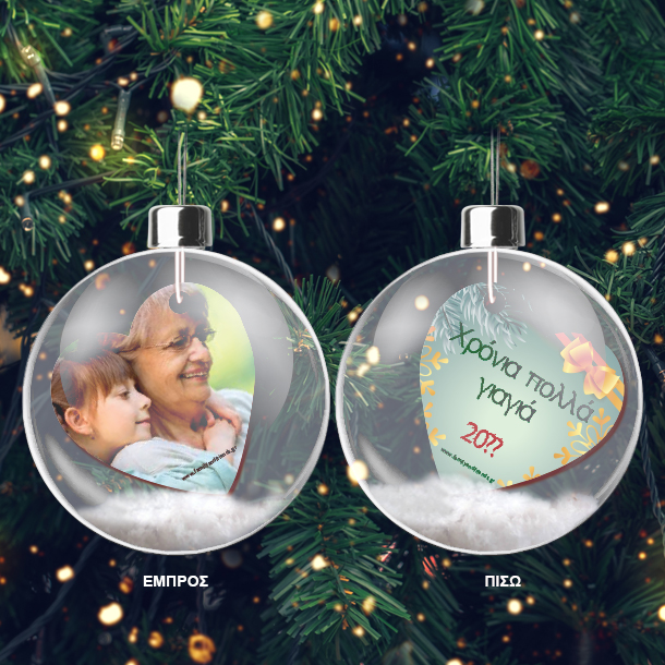 Η Πρωτότυπη Χριστουγεννιάτικη Διακοσμητική Μπάλα με Ευχές και Φωτογραφία για το Δένδρο, δυο όψεων είναι το διαφορετικό χριστουγεννιάτικο δώρο που θα κάνετε είτε στον ευατό σας είτε στον παππού και την γιαγιά για να πείτε χρόνια πολλά με ένα γιαφορετικό και ξεχωριστό τρόπο.
