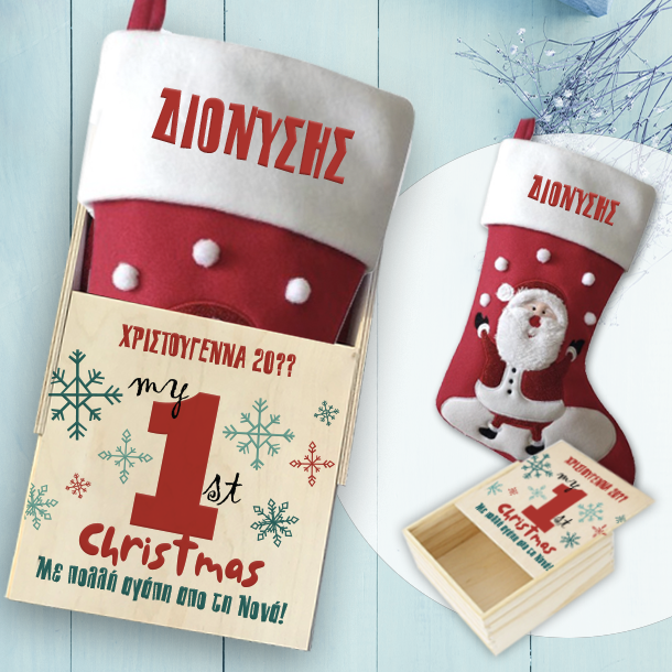 Αν αυτά τα Χριστούγεννα είναι τα πρώτα του μωρού σας κάντε του ένα μοναδικό Χριστουγεννιάτικο, Μπότα σε Ξύλινο Κουτί με Όνομα, Ευχές. Ένα διαφορετικό Χριστουγεννιάτικο Δώρο για Αγόρια & Κορίτσια. Μπότα σε Ξύλινο Κουτί με Όνομα, Ευχές, χριστουγεννιάτικο δώρο για τα πρώτα Χριστούγεννα σε κάθε παιδί, αγόρι, κορίτσι, γιορτινό δώρο στο ανηψάκι σας ή το εγγονάκι σας. Τα πρώτα μου Χριστούγεννα με Όνομα Μπότα σε Ξύλινο Κουτί με Όνομα, Ευχές, μπορείτε να βάλετε & το δωρο των Χριστουγέννων ή να το γεμίσετε με καραμέλες. Το Χριστουγεννιάτικο δώρο που θα ξεχωρίσει από όλα τα άλλα & θα μείνει αναμνηστικό για πάντα, στολίζοντας το δωμάτιο καθε αγοριού ή κοριτσιού για πολλά χρόνια. Βάλτε μαζί με την Κάλτσα όποιο άλλο Δώρο χριστουγεννων κάνετε στο βαφτιστήρι σας, μέσα στο Προσωποποιημένο Ξύλινο Κουτί με Μπότα με Ευχές, Όνομα.