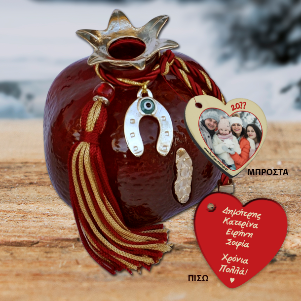 Ρόδι Γούρι Διακοσμητικό με Φωτογραφία, Ευχές, Δώρο για τα Χριστούγεννα Προσωποποιημένο, για Καλή Χρονιά και Καλά Χριστούγεννα. Ένα πρωτότυπο και οικονομικό δώρο που μπορείτε να κάνετε στις γιορτές που θα εντυπωσιάσει, σε όποιο φιλικό ή συγγενικό σπίτι είστε καλεσμένοι! Το Πρωτοτυπο Δώρο Χριστουγεννων για την νονα, νονο, Γυάλινο Ρόδι Γούρι, με καρδιά με Φωτογραφία, Ευχές, για καλή χρονιά, φτιάχνεται κάθε φορά αποκλειστικά μόνο για τον δικό σας νονό, φίλο ή συγγενή γιατι έχει το ονομα του και τις ευχές σας!