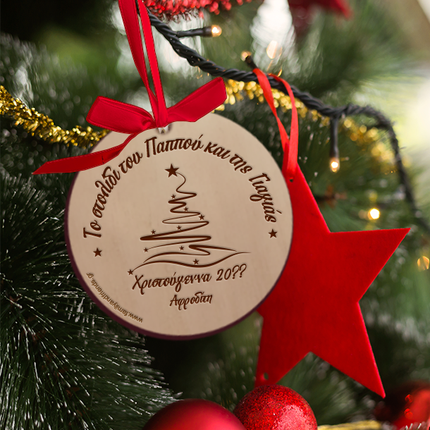 Πρωτότυπo στρογγυλλό στολίδι ξύλινο, για Χριστουγεννιάτικο Δέντρο, Προσωποποιημένο με χάραξη, Συνοδεύονται με κορδελάκι