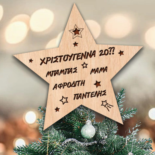 Ξύλινο Αστέρι Κορυφή Δένδρου με Ονόματα, Μήνυμα